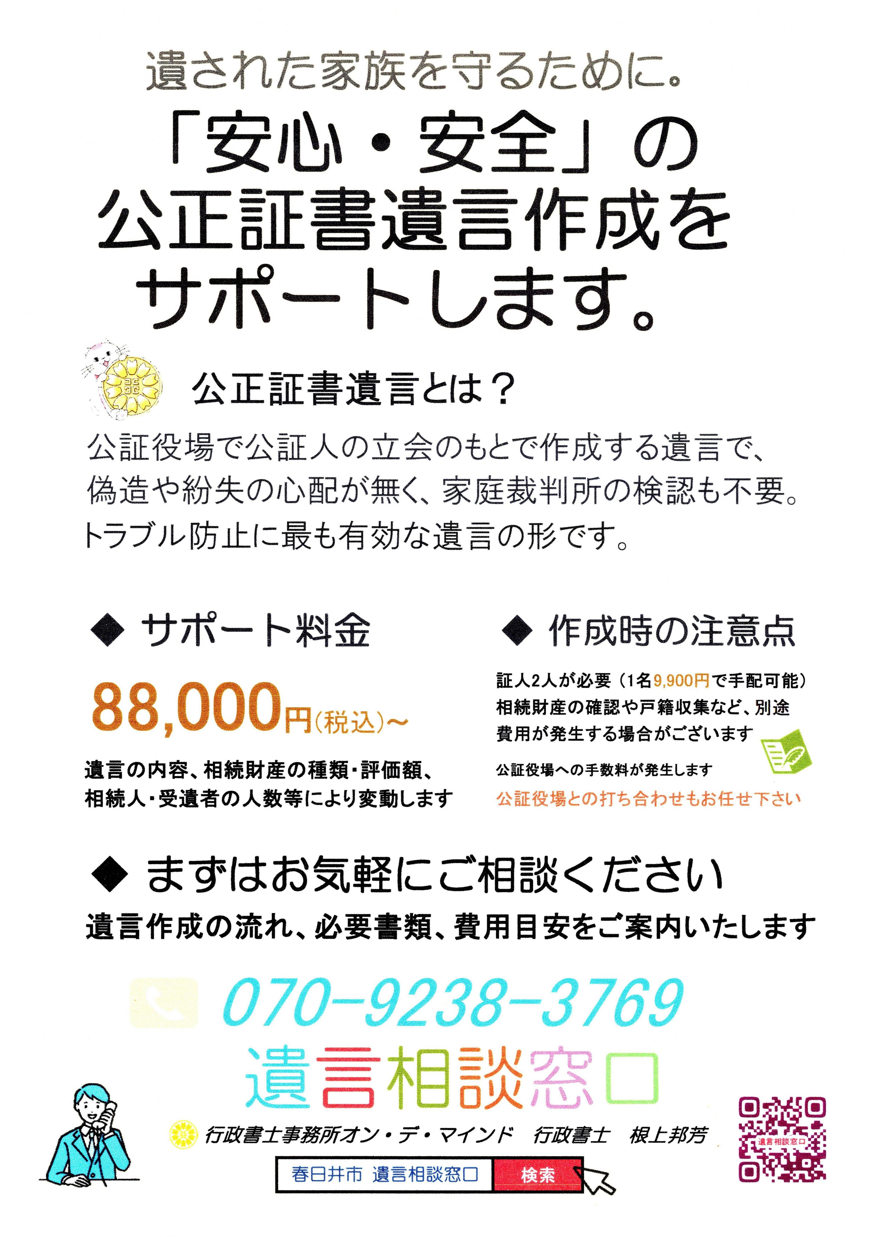 | | | 公正証書遺言の特徴 公証人の立会いのもとで作成される遺言です。遺言者が口述した内容を公証人が書面に記録し、遺言者と証人が署名することで成立します。公証人が内容を確認するため、遺言の内容が法的に有効である確率が高く、遺言書が後で発見されないというリスクも減ります。遺言者の意思が明確に記録されるため、紛争を避けやすい点が特徴です。 |